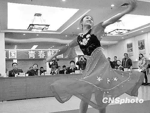 8時10分,面試開始,第一個上場的陳曉琴做了簡單的自我介紹,大屏幕顯示她抽中的問題是:如何能做一個合格的軍人。陳曉琴說,要做一名合格的軍人不但要嚴明紀律、聽從指揮,還要團結(jié)同志。接著她表演了跆拳道,并拿下了北京市女兵面試的第一個分數(shù)——26分,全部考試,陳曉琴用了8分鐘。 8時50分,來自民族大學(xué)舞蹈學(xué)院的5號應(yīng)試者朱瑜上場了。回答了相關(guān)的問題后,她拿出了一把藍色的綢扇,跳起了一套她自編的舞蹈,婀娜的舞姿征服了全場的觀眾,也征服了9位評委,她得了28.57的高分,這個分數(shù)也是海淀考區(qū)全天考試的最高分。與她同樣得了最高分的還有清華大學(xué)的王曉麗。