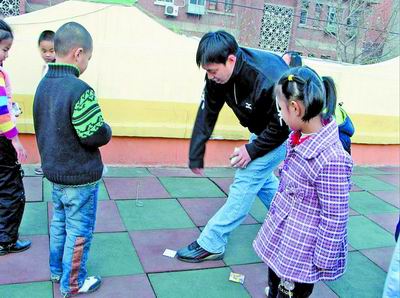 而在“玩”的時候,男女老師的不同就會顯現(xiàn)而出。據(jù)介紹,女老師一般是和孩子們玩一些如丟手絹之類活動量較小的游戲,而男老師就會帶著孩子們玩一些活動量較大的項目,比如競技賽跑等!澳欣蠋煄У陌嗌系暮⒆訒容^‘瘋’,這是我們愿意看到的,孩子充滿活力是件好事!眲⒚麝栒f。