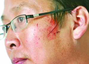 昨天,記者在新集中學(xué)見到陳宏濤,他的左耳上部腫得老高,顴骨處有一道約兩寸長的傷口,鼻梁處也有幾道血口子。