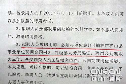 雷波說(shuō),他參加工作后,日子越過(guò)越窮,孩子感冒都不敢去醫(yī)院治療。類(lèi)似雷波的遭遇,在180名選聘教師的每個(gè)人身上都上演著。從4月2號(hào)開(kāi)始,這些教師紛紛丟下學(xué)生,到橫山縣人民政府討說(shuō)法。橫山縣人事和勞動(dòng)社會(huì)保障局辦公室的工作人員稱(chēng),當(dāng)初的考試是為解決中專(zhuān)生就業(yè)而進(jìn)行的,雷波等人屬于民辦教師,難以做到與中專(zhuān)生同工同酬。