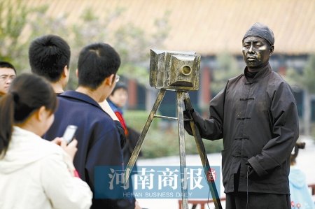 河南開封翰園里游客如織。喧囂的人群中,一尊雕塑寂靜地立在花壇之上,文靜的少女端坐琴前,專注的表情仿若與世隔絕。只有白天的每個整點時刻,游客才會發(fā)現(xiàn)這些雕塑“活著”。