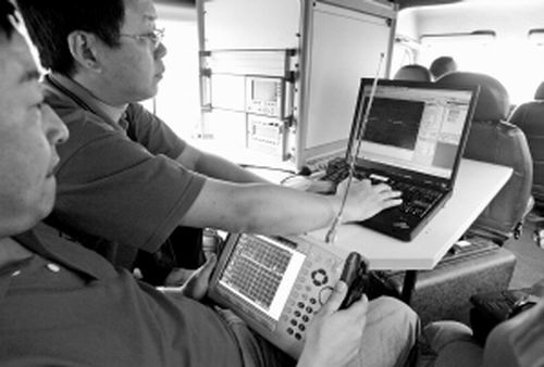 據(jù)了解,信息探測車?yán)锍斯P記本電腦顯示信號外,還有一臺專門監(jiān)測儀器!靶盘杺魉瓦M(jìn)來后,無線電監(jiān)測儀就會發(fā)出信號,一旦發(fā)現(xiàn)可疑信號,會立即追蹤信號源,然后將其屏蔽。屏蔽的都是‘點(diǎn)’,附近的通訊不會受影響!惫ぷ魅藛T稱,昨天上午共截?cái)嗔藘蓷l信號。由于監(jiān)測到的時間較短,所以該儀器只能屏蔽信號源,考生的位置無法鎖定。截至記者發(fā)稿時,公安機(jī)關(guān)已通過市信產(chǎn)局監(jiān)控的信號,抓獲了兩名傳送可疑信號的嫌疑人,并將其拘留作進(jìn)一步調(diào)查。