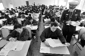 廣州市公安局今年向社會公開招聘650名交通協(xié)管員,每人每月工資獎金2100元、社保經(jīng)費(fèi)500元的待遇引來市民火爆報(bào)名,據(jù)了解,共有6002人上交材料和報(bào)名表,有4700名參加了體檢,最終有2616人取得參加昨日筆試的資格。參加筆試者30歲以下的占了四成,女性占了25%。