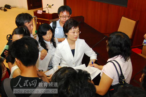由于教育部前任新聞發(fā)言人王旭明頗受媒體重視,其高調(diào)卸任,引起了媒體對新任發(fā)言人的興趣。今天第一次站在媒體面前的續(xù)梅略施粉黛,一直微笑著面對各路媒體。整場新聞發(fā)布會,續(xù)梅恪守主持人的職責(zé),說完開場白之后,便逐一介紹與會人士,自始至終沒有發(fā)表個人意見,與王旭明的“大放厥詞”大相徑庭。