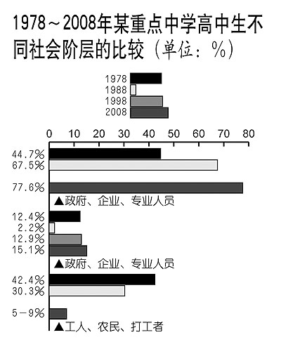 “從調(diào)查結(jié)果看,來(lái)自政府管理者、企業(yè)管理者與專業(yè)技術(shù)人員等傳統(tǒng)和新興的優(yōu)勢(shì)階層的子女獲得了最多進(jìn)入重點(diǎn)高中的機(jī)會(huì),而社會(huì)弱勢(shì)階層享受優(yōu)質(zhì)教育資源的機(jī)會(huì)則逐漸減少,尤以工人、農(nóng)民的子女下降最為顯著,”王雄說(shuō),“大學(xué)生的社會(huì)階層背景,與高中生的社會(huì)階層背景是基本同構(gòu)的,高等教育入學(xué)機(jī)會(huì)狀況是高中教育的直接延續(xù)!