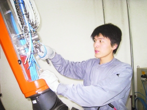 車間的流水線突然發(fā)出報警,機(jī)器人隨之停止工作。4月10日上午10時,楊雪峰正坐在中控室監(jiān)視流水線運(yùn)轉(zhuǎn),面前的紅燈閃個不停。他拎起工具包,和師傅跑到報警機(jī)器前。一個兩米多高的機(jī)器人“罷工”了!斑@個機(jī)器人是專給車身噴漆的,它一停,整個流水線就不能運(yùn)轉(zhuǎn)了!睏钛┓蹇刂谱⌒睦锏木o張,緊握扳手的右手有些微微顫抖,爬上流水線和師傅一起查找原因,“進(jìn)廠后就沒修過機(jī)器人這個大家伙,在師傅身后學(xué)了半年,這回終于派上用場了!