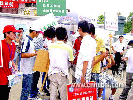 記者從其中一處咨詢(xún)點(diǎn)起身后,沒(méi)走上幾步,立即圍上四五名招生人員,爭(zhēng)相介紹自己的學(xué)校,均稱(chēng)自己是重點(diǎn)大學(xué)的正規(guī)自考招生。其中一名招生人員向記者推介:“他們有的雖然掛個(gè)大學(xué)的牌子,其實(shí)是在外面租房子教學(xué),而我們是在校本部辦學(xué)!泵鎸(duì)圍在身邊的招生人員,記者表示,要單獨(dú)考慮對(duì)比一下再?zèng)Q定,但仍有3人緊跟不舍。他們表示,高考分?jǐn)?shù)并不重要,兩三百分都可以報(bào)名。