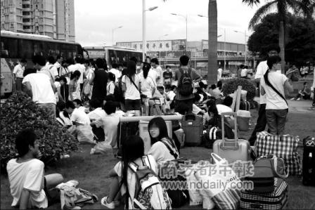 前天下午6時(shí)許,記者趕到松崗文化廣場(chǎng),仍然有100多名學(xué)生滯留在那里。其中一個(gè)學(xué)生告訴記者,他們來自廣東輕工職業(yè)技術(shù)學(xué)院,這次共有300多名大一和大二的學(xué)生來深圳打暑期工。同學(xué)們每人交了100元包車費(fèi),早上從廣州出發(fā),中午11點(diǎn)多到松崗,卻被廠方告知人員已經(jīng)招滿。