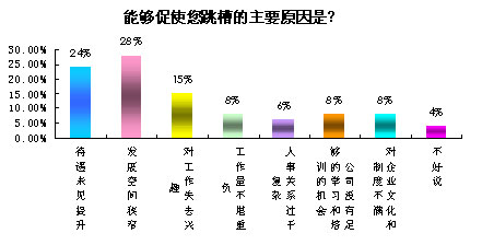 調(diào)查中也發(fā)現(xiàn)令職場(chǎng)人士下定決心跳槽的幾大因素。受訪人士中16%的人士選擇“有較高的收入或是職位”,13%的人士選擇“更好的學(xué)習(xí)機(jī)會(huì)和積累過程”,其次包括公司規(guī)模、是否工作繁忙等等都成為選擇重要依據(jù)。這和另一項(xiàng)調(diào)查“什么情況下會(huì)拒絕Offer”基本相對(duì)應(yīng)。職位和薪水和心理預(yù)期落差太大成為拒絕Offer的主要因素。