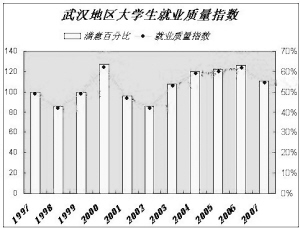 對2007年就業(yè)的2000名應(yīng)屆本科畢業(yè)生進行的隨機問卷調(diào)查顯示,這批工作滿1年的畢業(yè)生就業(yè)滿意率為54.4%,此前就業(yè)滿意率一度從2002年的42%升到2006年的61.9%。