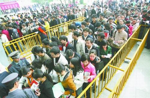 經(jīng)兩天“海選”,由成都市人事局主辦、成都人才市場承辦的2008成都冬季特大型人才招聘會暨高校畢業(yè)生供需洽談會,昨日(11月16日)在世紀城新會展中心正式落幕。作為今冬規(guī)模最大的一次特大型招聘會,今年只有324家企業(yè)攜6226個崗位前來“選秀”。盡管招聘單位和崗位數(shù)量大幅縮水,但兩天時間里求職大軍數(shù)量仍逼近7萬。