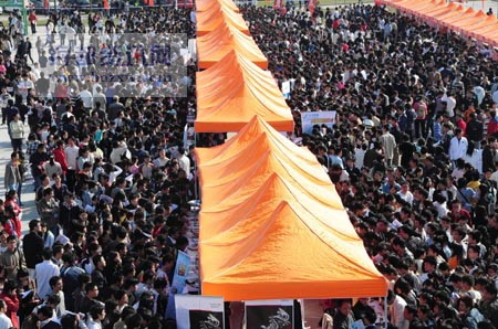 酒店“門童”、“運送員”,這些原本與大學生不沾邊的崗位,昨日(11月20日)出現(xiàn)在福州舉行的大學生招聘會上。昨日,由福建省人事廳、中國海峽人才市場聯(lián)合舉辦的“福建省2009年大中專畢業(yè)生福州地區(qū)大學新校區(qū)專場招聘會暨大學生見習招聘會”,在福建師范大學旗山校區(qū)拉開帷幕,有上萬名學生進場應聘。