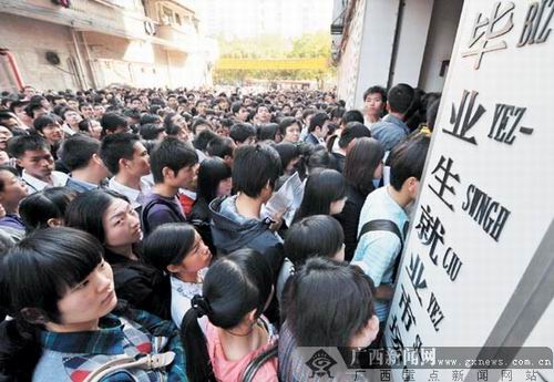 2月11日,廣西師范學(xué)院畢業(yè)生小陳特地起了個(gè)大早,趕在8時(shí)30分來(lái)到南寧市人才市場(chǎng),參加當(dāng)天舉行的春季高校畢業(yè)生專(zhuān)場(chǎng)招聘會(huì)。令小陳吃驚的是,人才市場(chǎng)入口處已有兩三百名畢業(yè)生在等候,原打算提前占據(jù)“有利地形”的他,只能排在離入口約20米遠(yuǎn)的空地。
