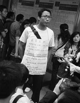 4月26日,一位身著淺藍(lán)色T恤、戴著黑邊眼鏡的男青年出現(xiàn)在成都市寧夏街人才市場(chǎng)門口。他的穿著打扮很普通,胸前掛的一塊“賣身求職”的牌子卻十分醒目,引來(lái)眾人圍觀。從這塊白紙紅字的牌子上可以得知,這名男子叫王志強(qiáng),今年25歲,身高1.75米,大學(xué)文化。2005年他南下廣東,干過(guò)兩年管理工作。由于金融危機(jī),企業(yè)倒閉,所以“現(xiàn)賣身求職,要求年薪至少10萬(wàn)元!