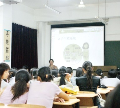 昨晚7點,在該校一間可容納90人的大教室里已坐滿了女生,有的正認真做著筆記,有的與同伴小聲交談著。講臺上,女教師在介紹該課的主要內(nèi)容,包括女子生殖系統(tǒng)、避孕、婦科病等知識。