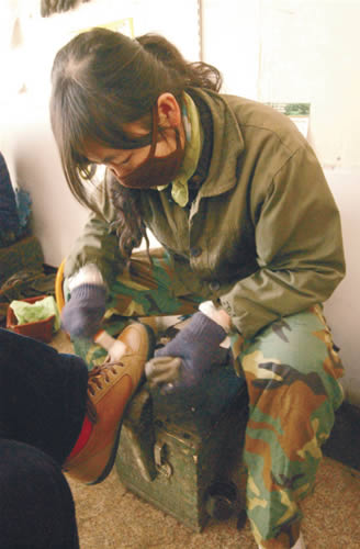 放假在家的她,白天呆在臺(tái)安縣新華書店一樓的過道里擦皮鞋,見有顧客來,她馬上拿起鞋刷,熟練地打油上色,掙2元擦鞋費(fèi)。