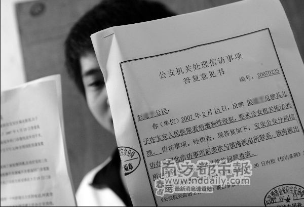 鎮(zhèn)南派出所通過寶安區(qū)公安分局對記者表示,這件事開始移送給檢察院時因為證據(jù)不足,而被檢察院發(fā)回繼續(xù)取證,目前還在進一步取證中。而彭先生表示,派出所跟他說的是目前該案的材料已經(jīng)移交給寶安分局法制科,再由法制科送交區(qū)檢察院。寶安區(qū)檢察院一位檢察官表示,目前他們只有鎮(zhèn)南派出所送來的部分材料,而完整的材料還沒有移送過來,因此目前尚不能對該事件進行定性或起訴。