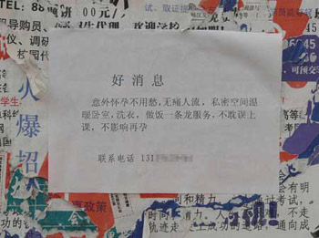 在東北師范大學就讀的郭同學告訴記者,前不久她在宿舍樓下的留言板上也發(fā)現(xiàn)了一張類似內(nèi)容的廣告單,上面印有“意外懷孕不用愁,XX醫(yī)院來解憂,采用超導可視無痛人流,不損傷正常組織……”郭同學說:“很多女同學看到這樣的廣告都臉紅了,即便現(xiàn)在社會比以前開放了,但這種廣告也不該出現(xiàn)在校園里吧!