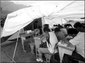 昨天下午,茂縣中學(xué)操場上架起了8個巨大的白色帳篷,帳篷上印有聯(lián)合國兒童基金會的藍(lán)色標(biāo)志。每頂帳篷里都坐滿了高三學(xué)生。為了散熱,帳篷兩側(cè)都被撩起來通風(fēng)。4點剛過,喧鬧的帳篷內(nèi)頓時安靜下來,其中一個帳篷里不久后傳出了一片讀書聲。旁邊的“教室”內(nèi)學(xué)生們安靜地做著卷子。記者悄聲問坐在帳篷邊的一位女生上什么課,她悄聲回答:“地理!