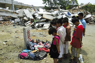 “5·12 ”地震發(fā)生后,四川德陽(yáng)什邡市一名從廢墟中爬出來(lái)的13歲小孩,曾英勇救出3名同學(xué)和一名懷孕教師。昨天,該少年來(lái)到學(xué)校倒塌的校舍里刨出10余個(gè)書(shū)包,將它們整整齊齊地?cái)[放在廢墟旁邊一塊寫(xiě)有“奠”字的碑前,然后與其他同學(xué)一道默哀3分鐘,以此方式來(lái)陪伴遇難的同學(xué)一起過(guò)兒童節(jié)。