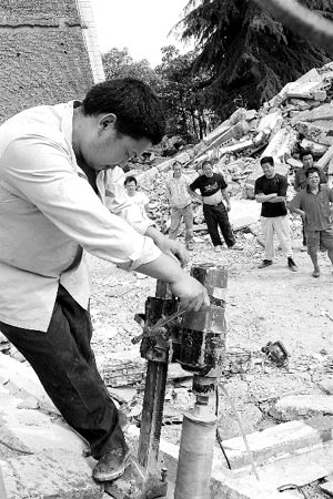 家長們很不理解,大聲質(zhì)問:“為什么不透露單位名稱?我們怎樣得到檢測結(jié)果?”“我們是四川禾力建設(shè)工程質(zhì)量檢測有限公司的。”工作人員忙說。該公司另一組取樣人員,正在對綿竹市幾所學校的建筑廢墟進行取樣。隨著機器的轉(zhuǎn)動,一個個標本從大梁中取出,他們在樣本上標注上日期和地址等信息。