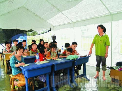 一位村民特意將學(xué)校的情況拍下來(lái)發(fā)到網(wǎng)上,吁請(qǐng)社會(huì)各界關(guān)心和支助。陸續(xù)有人送來(lái)書(shū)包、課本、文具、小黑板和課外讀物。什邡圣修堂的教職人員,幫他們聯(lián)系到志愿者前來(lái)任教,附近抗災(zāi)的部隊(duì)官兵為學(xué)校搭建起一頂新帳篷。
