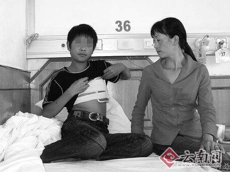 據(jù)阿強(qiáng)回憶,今年6月12日晚,他在文山南鷹學(xué)校內(nèi),因多了一句嘴即被其班主任陳老師痛打。當(dāng)日晚9點(diǎn)多,晚自習(xí)后,阿強(qiáng)和其他同學(xué)一起回宿舍拿洗漱工具到水管處洗臉腳,后按常規(guī)到校內(nèi)一斜坡空地集合接受老師清點(diǎn)人數(shù)時(shí),班主任陳老師宣布還要進(jìn)教室上自習(xí),有幾名學(xué)生因此不滿(mǎn),阿強(qiáng)也跟著叫了一句:“如果這樣補(bǔ)晚自習(xí)的話(huà),那還不如每天晚上都到12點(diǎn)鐘才睡覺(jué)。”隨即遭到陳老師一陣痛打……“我當(dāng)晚睡覺(jué)就感到左胸部疼了!”阿強(qiáng)告訴記者:“我被打的第二天,因?qū)W校按常規(guī)放假即回了遠(yuǎn)在西疇的家,回家后也不敢和父母說(shuō)被老師痛打的事;返回學(xué)校后,我告訴陳老師我被他打的部位還疼,陳老師告訴我要過(guò)一段時(shí)間才會(huì)好。”直至6月23日,阿強(qiáng)疼得受不了,才向老師提出要打電話(huà)叫母親來(lái)接他離校檢查,后經(jīng)同意才得以向家人說(shuō)出實(shí)情……