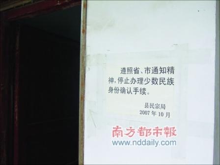 在民宗局辦公室的門(mén)口處,張貼著落款為“2007年10月”的一份告示,“遵照省、市通知精神,停止辦理少數(shù)民族身份確認(rèn)手續(xù)!迸砹f(shuō),這是因?yàn)檎宜齻冝k民族變更手續(xù)的人很多,“很煩,就在門(mén)口貼了這張公告。”