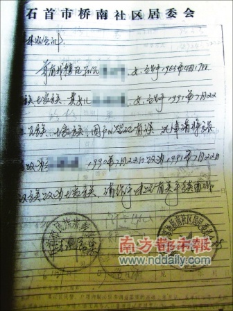 7月18日下午,石首市繡林辦事處槐樹(shù)堤居委會(huì)辦公室張會(huì)計(jì)回憶,2006年7月25日,一名婦女曾找到她,請(qǐng)居委會(huì)開(kāi)具一份證明,這名婦女還找來(lái)了一位熟人,以證明她的身份。由于有熟人介紹,她便蓋了公章。