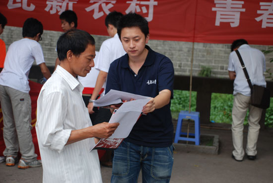 7月14日上午,適逢長(zhǎng)沙鎮(zhèn)趕集,開(kāi)縣團(tuán)縣委聯(lián)合重慶工程職業(yè)技術(shù)學(xué)院大學(xué)生暑期三下鄉(xiāng)社會(huì)實(shí)踐團(tuán)在長(zhǎng)沙鎮(zhèn)開(kāi)展改革開(kāi)放三十年成就宣講服務(wù)活動(dòng)。當(dāng)日上午,三十名宣講成員冒著酷暑向過(guò)往群眾宣講,宣講活動(dòng)按思想建設(shè)、國(guó)防科技、百年奧運(yùn)、民主法制、社會(huì)民生等10個(gè)部分圖文資料生動(dòng)地展現(xiàn)了祖國(guó)改革開(kāi)放三十年取得的巨大成就。駐足觀看的群眾絡(luò)繹不絕,在展覽前打起了傭堂,他們有的深情凝望圖片資料,有的和大學(xué)生攀談改革開(kāi)放三十年來(lái)自己生活的變遷。