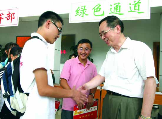 正在王德鑫和王剛填寫表格的過程中,中科大校長朱清時院士來到了他們身邊,“歡迎你們來到中科大!”校長向他們伸出了溫暖的大手。聽說王德鑫和王剛早早就立志考科大,朱校長高興地說,“我也是四川人,也是早早立志考科大,我是1963年考上的,到現(xiàn)在45年了!痹诹私獾酵醯脉问且粋人來報到時,朱校長連聲夸贊他“了不起”,“現(xiàn)在一個人來報到的學(xué)生可不多了,當(dāng)年,我們都是一個人來學(xué)校的!”在向兩位同學(xué)簡單介紹了“綠色通道”的報名程序后,校長再次祝福他們:“祝愿你們在中科大的生活和學(xué)習(xí)一切順利!”