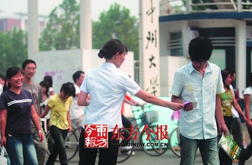 上午11時,發(fā)放點移到中州大學(xué)和鄭州師專門口,正在報名的學(xué)生和家長明顯增多,看到計生人員發(fā)宣傳資料,很多學(xué)生主動圍了上來。