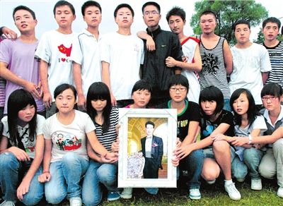 在孩子們排成兩行的弧形隊列里,居于中心位置的是一個很特別的“老師”,“他”不是一個有血有肉的人,而是一個彩色畫框。畫框里,身材頎長的他,打著領(lǐng)結(jié),戴著眼鏡,笑意盈盈,神采飛揚。他叫何海平,是這個完整存活下來的北川中學(xué)初三(4)班的班主任、英語教師。而今,他的學(xué)生們一個個都還活蹦亂跳的,他卻永遠地走了。