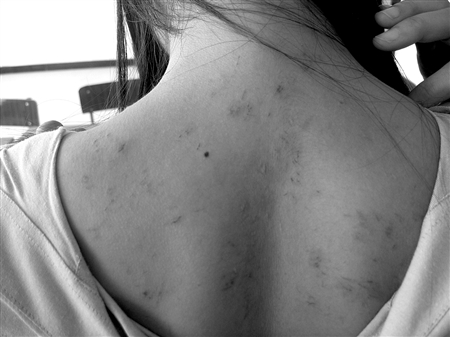剛開學(xué)不久,四川省弘博中等專業(yè)學(xué)校新生羅珊只是身上少數(shù)部位出現(xiàn)了紅疙瘩,她以為是被蚊子叮咬也就沒放在心上?筛袅藥滋鞂嬍依锏8名同學(xué)都陸續(xù)長(zhǎng)滿了“紅包包”,大家才開始著急起來。“特別是襠部、腿部等隱秘部位,一出汗又痛又癢,又不方便撓!迸⒂行┎缓靡馑嫉卣f。記者見到女孩背部紅了一片,癥狀較輕的脖子竟已經(jīng)被撓壞。因?yàn)閷W(xué)校為封閉式管理,學(xué)生們并沒有到醫(yī)院醫(yī)治,只到衛(wèi)生站診治了一下或僅是簡(jiǎn)單地涂了些外用藥。