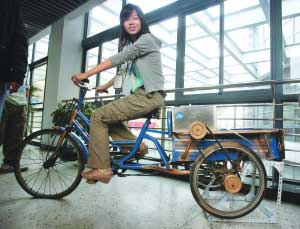 “快看,一邊蹬一邊就能洗衣服了!币惠v三輪車(chē)被參觀的學(xué)生團(tuán)團(tuán)圍住。這可不是一輛普通的車(chē),它可是集洗衣、健身于一體的新節(jié)能“產(chǎn)品”。