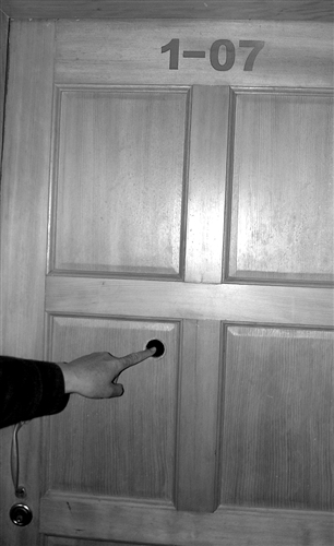 學(xué)生們還在上課,女生公寓空無一人,只有生活老師在里面守候,“鐵將軍”把住女生公寓的大門,生活老師打開大門后,記者進(jìn)入了女生公寓。女生公寓有7層樓高,過道兩旁對(duì)應(yīng)著一間間女生寢室。每間寢室的房門上,果然就有一個(gè)圓形小孔。這小孔直徑只有四五厘米,記者將眼睛貼近小孔朝里面一望,寢室里一覽無余。