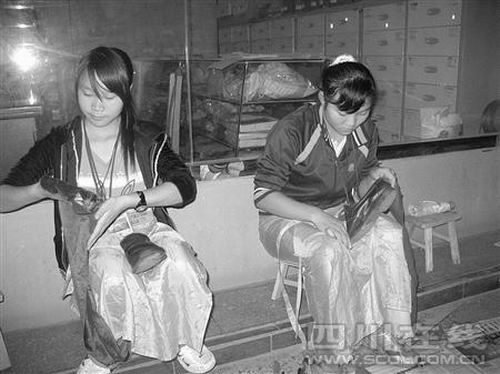 在一家火鍋店,電子專(zhuān)業(yè)高二學(xué)生邱飛詢(xún)問(wèn)一位顧客是否需要擦鞋——行話叫做“聯(lián)系貨物”。和一般的擦鞋人一人擦一雙不一樣,學(xué)生們的擦鞋是流水作業(yè):第一人先用清水勾縫、第二人上油、第三人用刷子拋光、第四人用抹布拋光……一雙皮鞋經(jīng)數(shù)人之手后,換得1元酬勞。