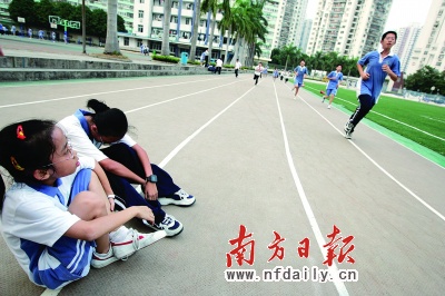 據(jù)氣象部門預(yù)報,深圳昨天晴間多云,東北風(fēng)2級,氣溫24—31℃。下午5時,實驗學(xué)校初中部的250米環(huán)形跑道上,初一(十)班的同學(xué)們正氣喘吁吁地跑步,隊伍有些稀稀拉拉。幾圈下來,不少學(xué)生的后背已經(jīng)濕透。一些剛跑完的學(xué)生已累得說不出話來,有些干脆一屁股坐在了地上。