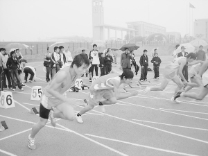 運(yùn)動會上,學(xué)生們在雨中比賽。