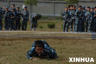 江東區(qū)兒童軍校一位小學(xué)員匍匐穿越“電網(wǎng)”