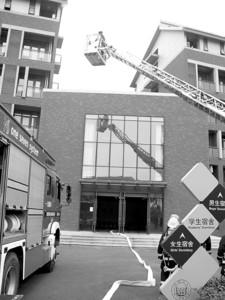 演練假設男生宿舍樓5樓發(fā)生火情,聽到警報后,學生們在廣播的指引下,拿毛巾捂住口鼻,迅速逃出了宿舍樓,不到5分鐘,451名學生就全部疏散到了警戒線外的安全地帶。與此同時,政和消防中隊也派員趕到了現場,戰(zhàn)士們先是從火場中救出了一名暈倒的男孩,緊接著,又架起30米云梯,將被困在5樓的另一名學生成功解救。