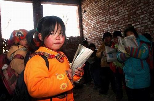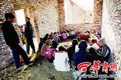 上午10時(shí)許,距董廟小學(xué)200米的地方傳來(lái)讀書聲。這是剛砌好不久的磚房,沒窗也沒門,學(xué)生分別待在幾個(gè)房間里,四下漏風(fēng),穿棉襖還是冷,大家圍成圈不停地跺著腳。老師用磚搭個(gè)簡(jiǎn)易爐,燒些樹枝讓大家能感覺點(diǎn)暖意!斑@種地方的確不能上課,總不能耽誤學(xué)業(yè),只好先找個(gè)地方解決了。”老師說。