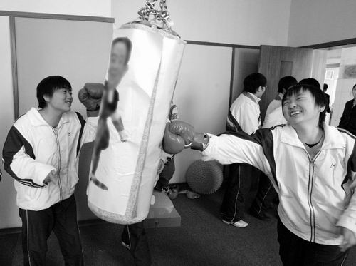 25日,記者走進陽光心靈驛站,黃色和藍色相間的墻面讓這個房間顯得格調平和而優(yōu)雅。驛站由陽光工作室、心理宣泄室、心理放松室三部分組成。站內還提供了諸如宣泄皮人、臉譜、放松球、沙袋及拳擊手套等宣泄工具,配備專業(yè)教師7名。記者注意到,該校分管學生的副校長孟凡祥和3位級部主任的頭像也上了沙袋,學生們打起來毫不手軟。