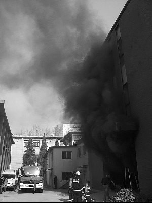 經(jīng)消防員撲救,大約20分鐘后,濃煙漸漸變小,消防員和幾名同學(xué)進(jìn)入實(shí)驗(yàn)室,將未燒毀的實(shí)驗(yàn)儀器、資料和一些辦公用品轉(zhuǎn)移出來。