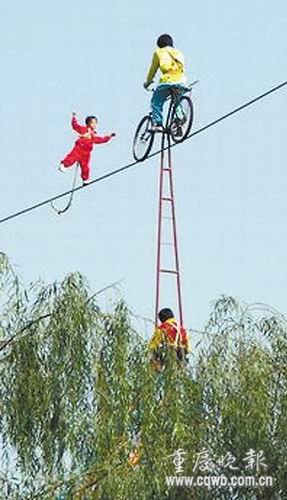 據(jù)了解,學(xué)走鋼絲的第一步是從單腳站磚頭開始,逐漸增加高度和難度。經(jīng)過這種循序漸進(jìn)的訓(xùn)練,張婭很快掌握了低空走鋼絲技巧。經(jīng)指導(dǎo),她又學(xué)會在鋼絲上表演“金雞獨(dú)立”、“旋轉(zhuǎn)”、“平臥”等高難度動作。通常,走鋼絲表演者手里要拿東西保持平衡,可張婭學(xué)藝一年左右,就能做到空手走鋼絲,還能突然躺在鋼絲上“睡覺”和“起床”!