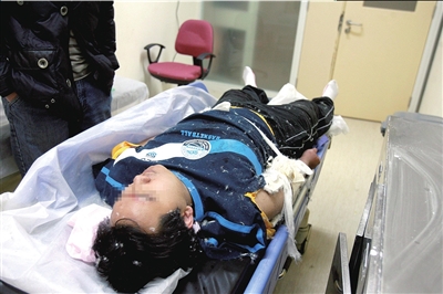 昨天下午5點,朝陽醫(yī)院急診大廳縫合室內(nèi),徐老師正在接受縫合手術(shù)。
