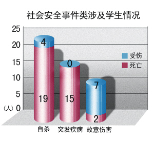 自殺 2008年高校共發(fā)生社會(huì)安全類事件45起(見(jiàn)圖二),涉及學(xué)生47人,造成36人死亡,11人受傷。其中居首位的是自殺事件,共23起,造成 19人死亡,4人未遂;15名大學(xué)生因突發(fā)疾病死亡,主要由于心臟、哮喘等疾病所致;校內(nèi)外故意傷害事件7起,造成2名學(xué)生死亡7人受傷,其中5起為三人以上的斗毆事件。