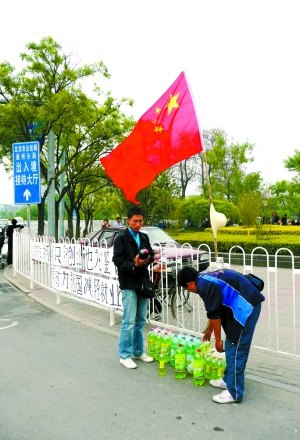 昨日下午,九棵樹地鐵站口北側(cè)的十字路口,陳進(jìn)和同伴俞洪帶著他們的可樂飲料,在人行道柵欄上又掛起他們的橫幅標(biāo)語,這次,他們插上了一面鮮紅的國旗,在風(fēng)中招展。