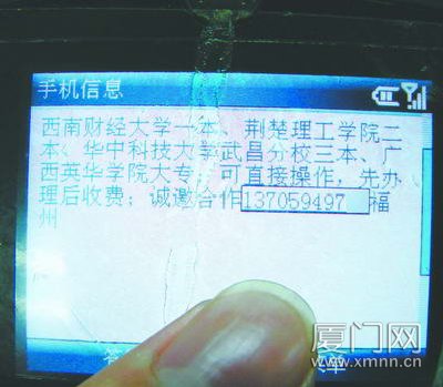 高考剛剛過去,本一院校的錄取工作正在如火如荼地進行,一些不法分子又在“摩拳擦掌”,打著“花錢就能上大學”的招牌到處蒙人。昨日,本報接到讀者關于騙人短信“高考分數(shù)不夠不要緊,只要交15萬元就可上西南財經(jīng)大學等重點本科院!钡膱罅虾螅浾哐杆龠M行調查。