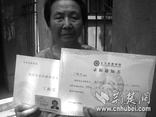 昨日(8月5日,下同)上午,家住漢口永清街趙家條的丁梅芳老太向記者展示了這封標(biāo)稱“北大資源學(xué)院(以下簡稱北資院)”,在8月3日寄達的錄取通知書。記者看到,該錄取通知書上寫著:“丁梅芳同學(xué),我校決定錄取你入數(shù)字傳媒學(xué)院系新聞傳播(本)專業(yè)學(xué)習(xí),請持本通知書于2008年8月25日……到校報到!